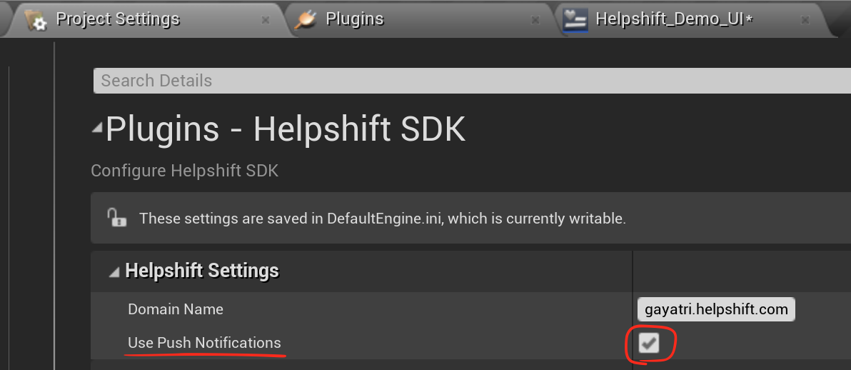 After you have configured the push notifications in the Helpshift console, you will need to add additional setup in the project, too. First of all, you should enable the Use Push Notifications toggle in the Project Settings: